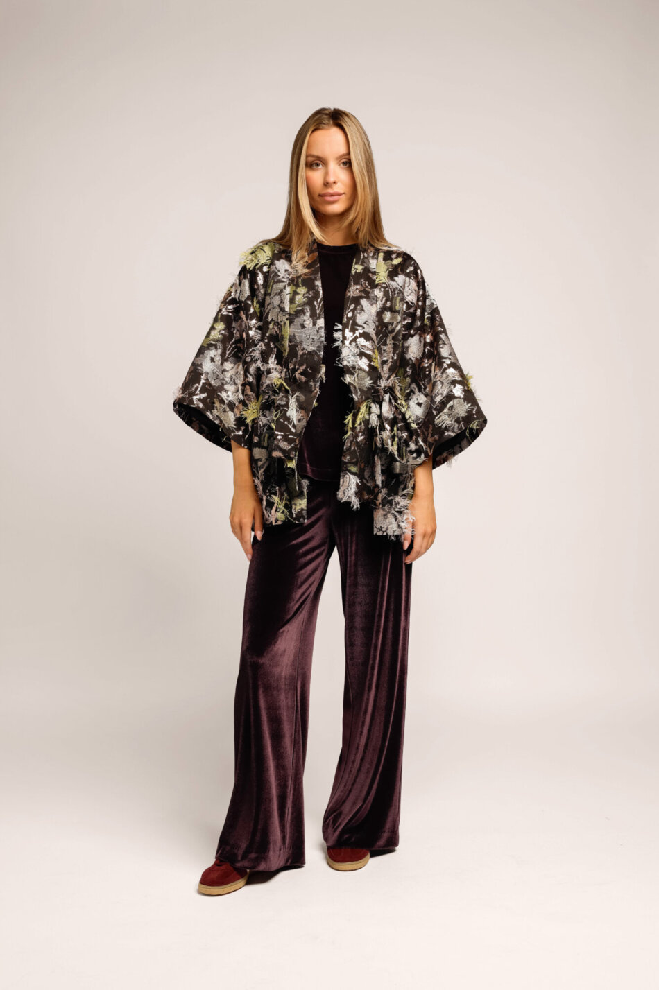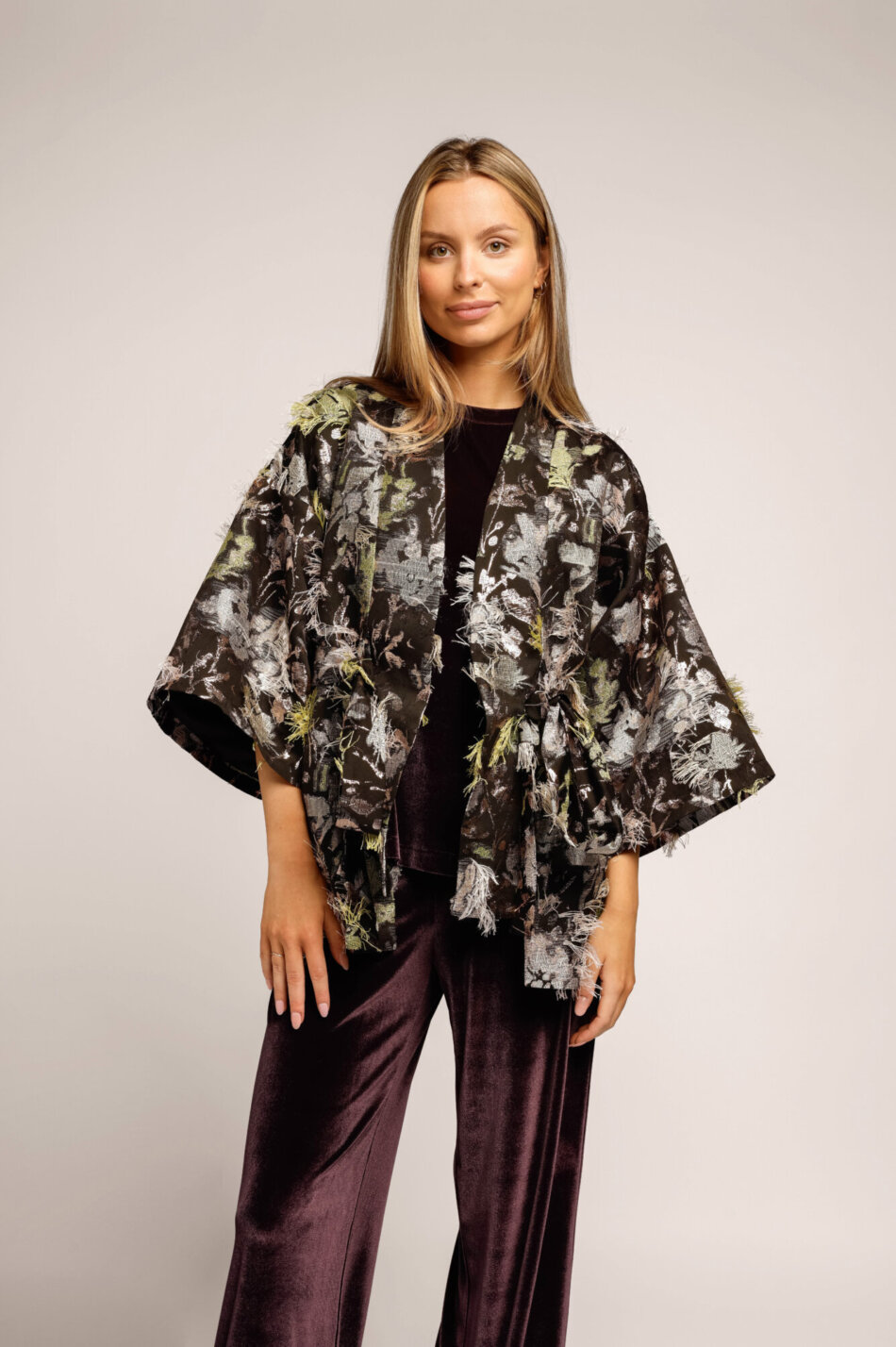 Luksuslikust kangast efektne kimonolõikeline jakk on lihtsasti kombineeritav nii vabaaja riietega kui ka pidulikumate esemetega Sinu kapis. Avar lõige lubab Sul olla eriti loominguline ja kanda jakki kihiti hooajast-hooaega. Vööga saad tõmmata jaki taljesse, aga võid vöö otsad mõnusalt ka sõlme keerata ja lasta hõlmadel mõnusalt lennata!