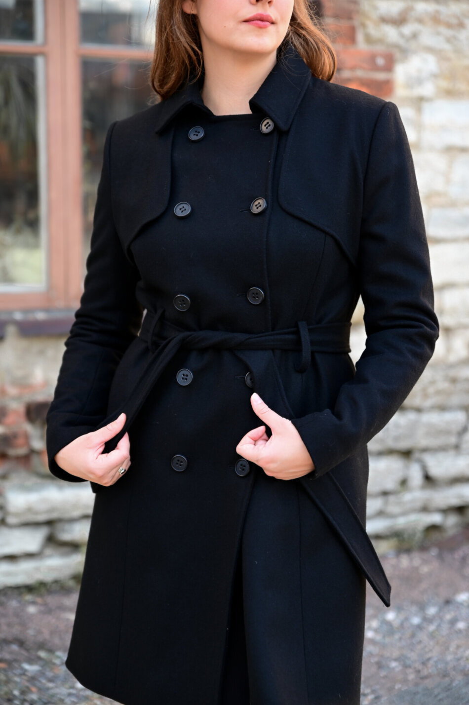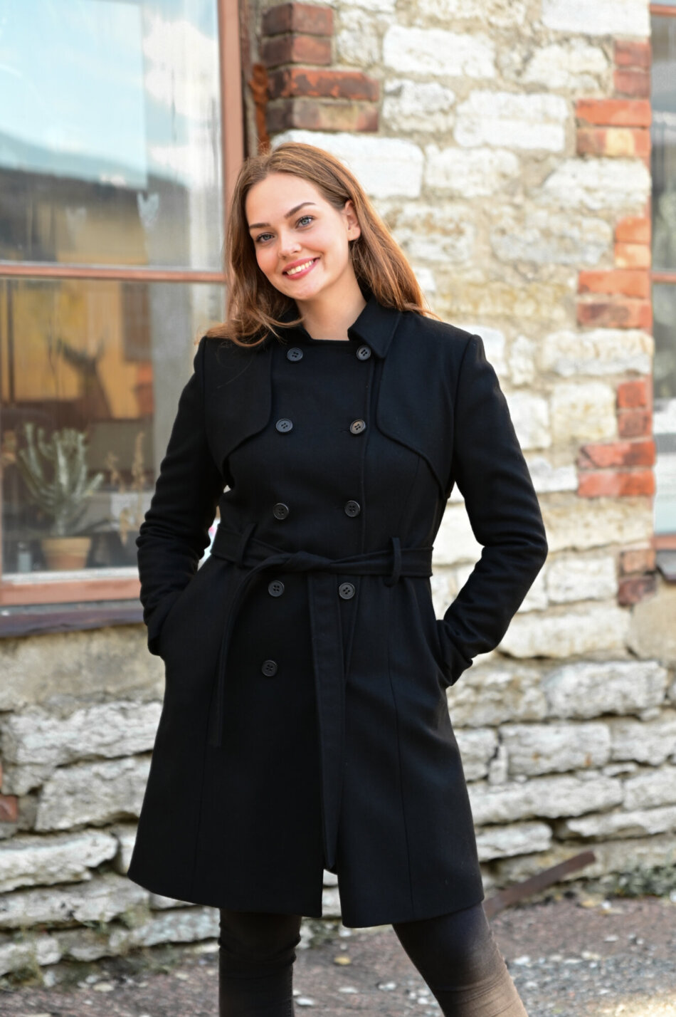 Klassikaline kaherealine nööpidega naiste mantel on 100% villasest kangast ning ajatu mantlimudel. Mantel on taljesse töödeldud ning tema õlaosa teeb eriliseks topeltkangast tormiklapid. Soojust lisab ka voodri all peidus olev vatiinikiht.