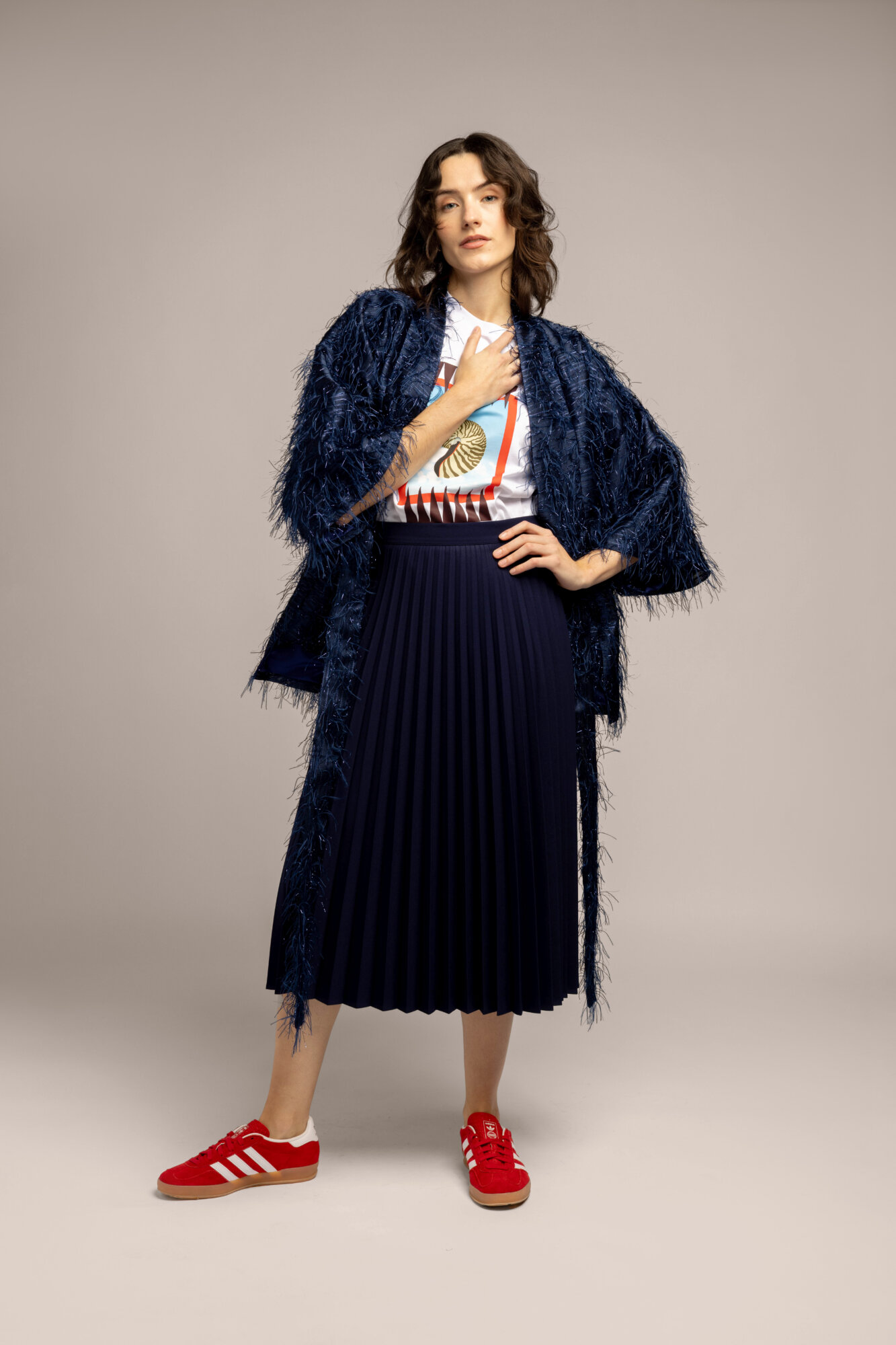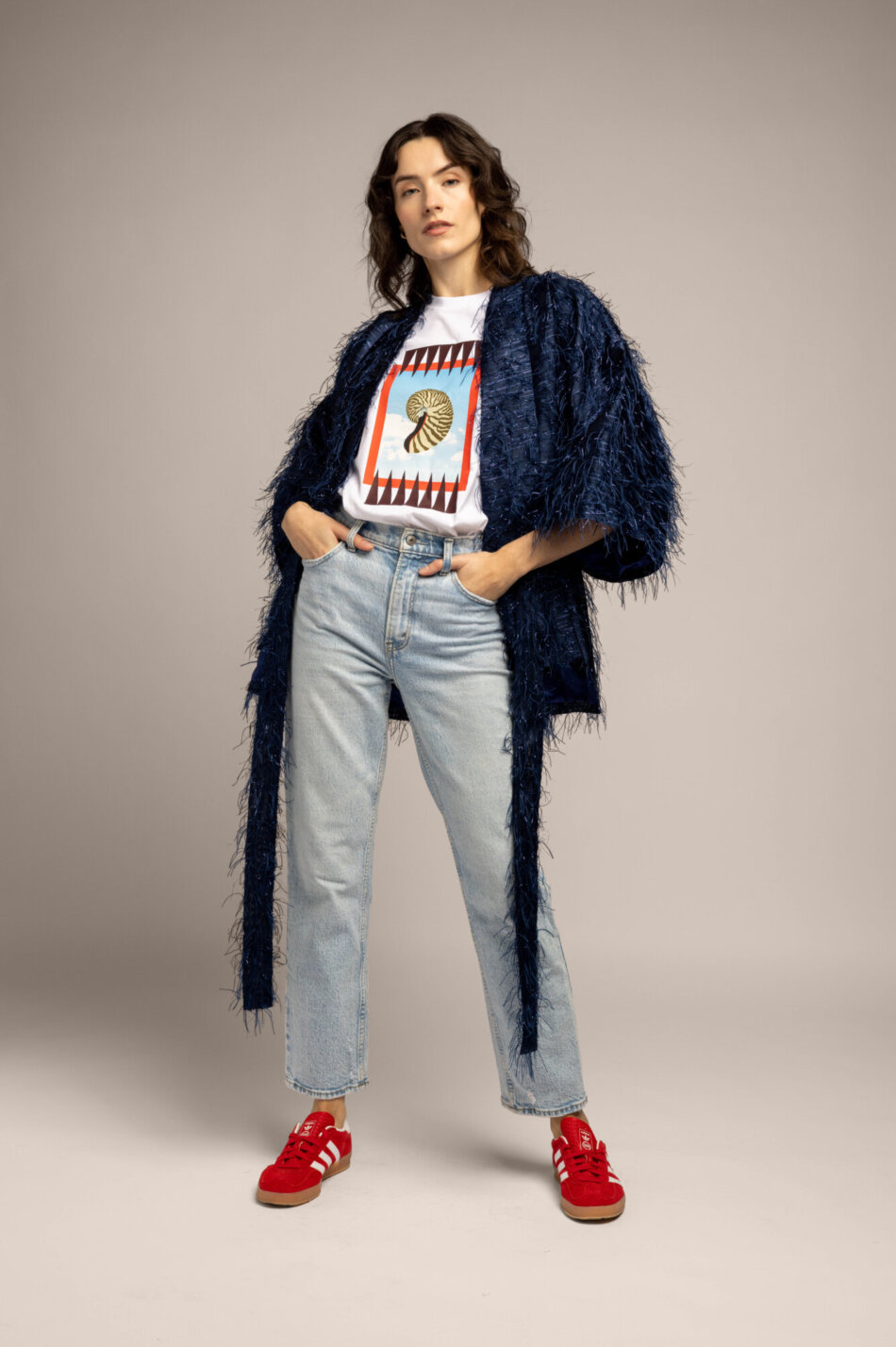 Luksuslikust kangast efektne kimonolõikeline jakk on lihtsasti kombineeritav nii vabaaja riietega kui ka pidulikumate esemetega Sinu kapis. Avar lõige lubab Sul olla eriti loominguline ja kanda jakki kihiti hooajast-hooaega. Vööga saad tõmmata jaki taljesse, aga võid vöö otsad mõnusalt ka sõlme keerata ja lasta hõlmadel mõnusalt lennata!